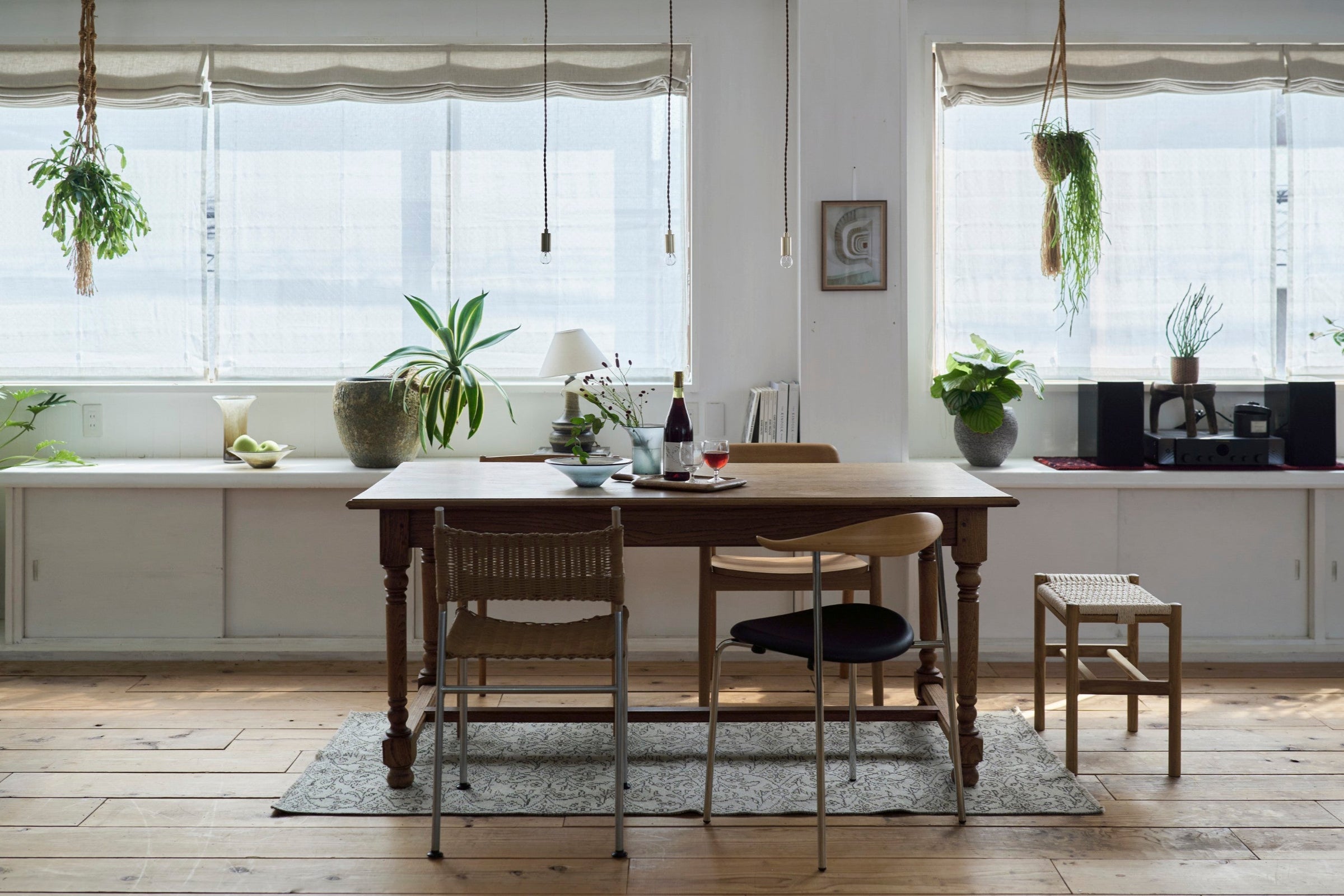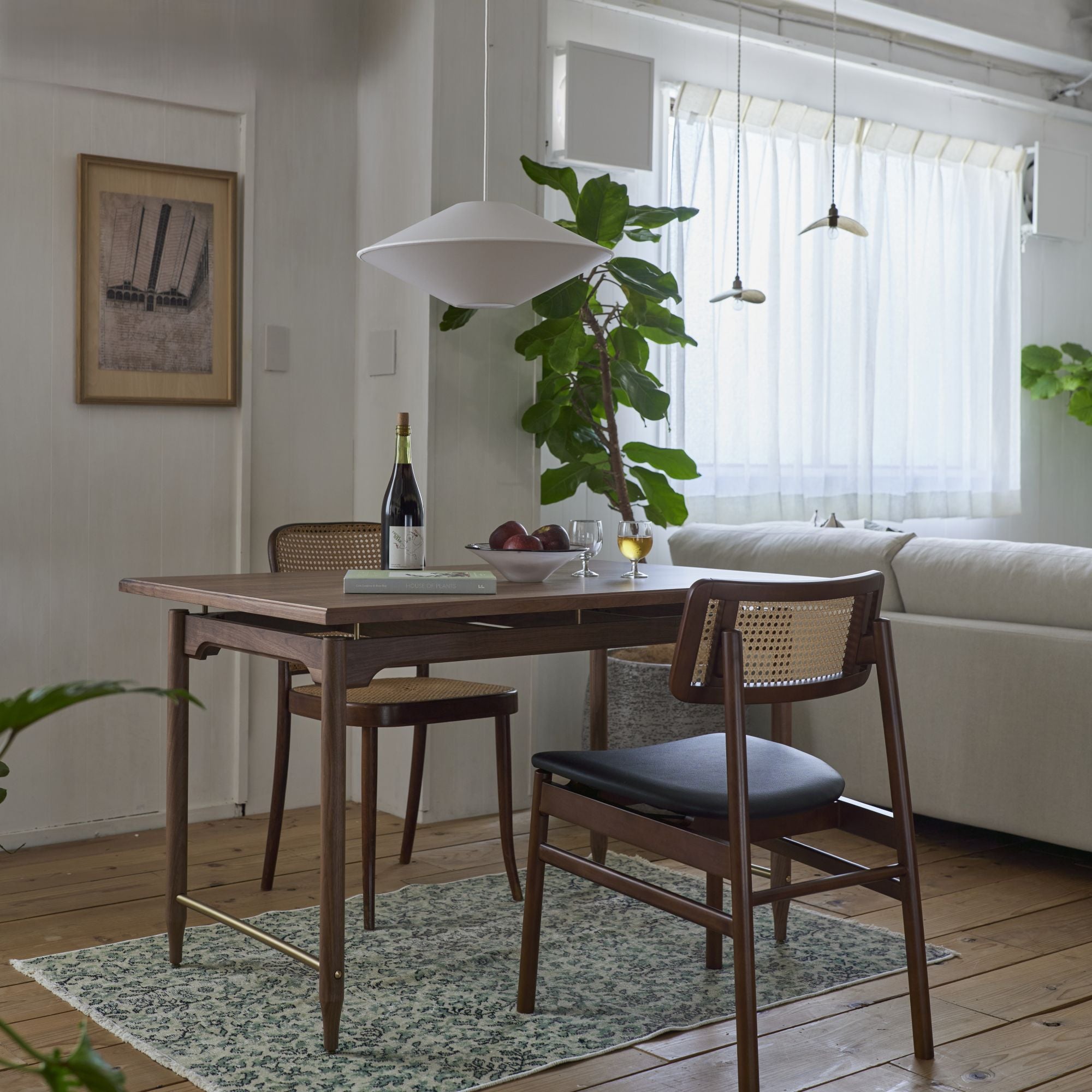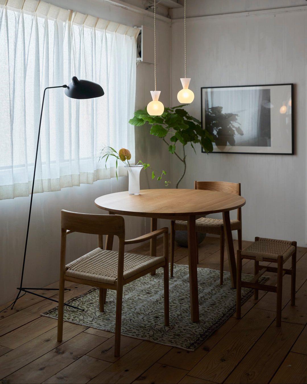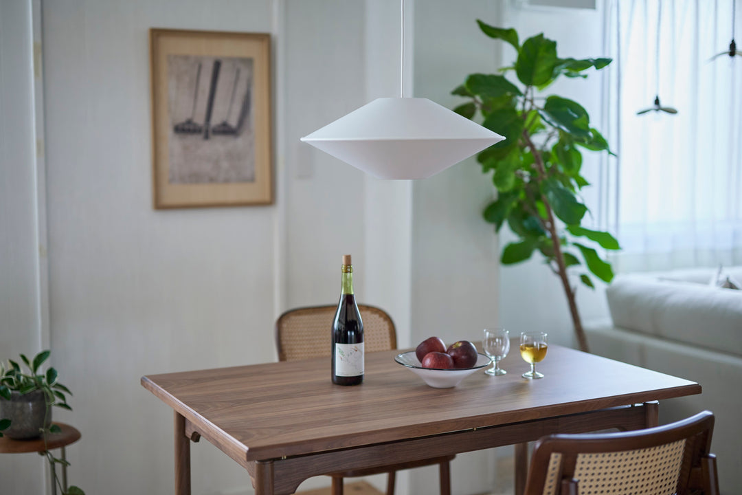 下方向に集まる光は、ダイニングテーブルを囲む時間を温かく照らし、透け感のあるガラスやラタンのシェードは、壁や天井にやわらかな影を描きます。