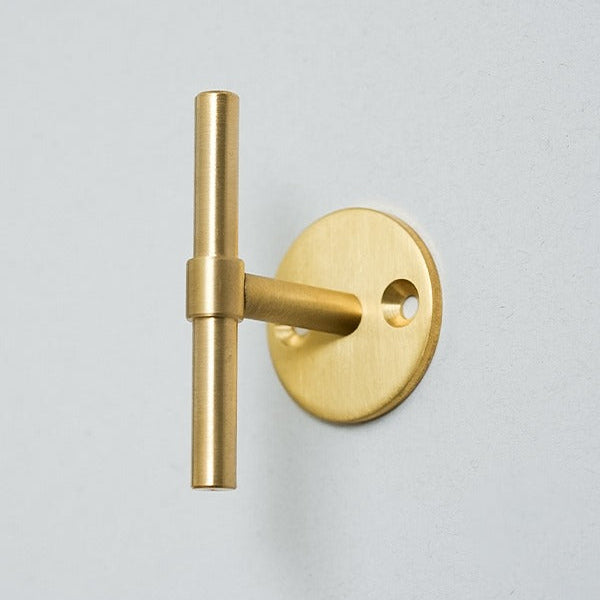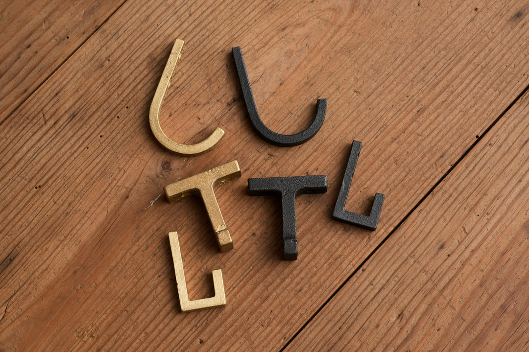 砂型鋳造で成形された真鍮フック。ストレート、スリム、イカリ型の3タイプで、鋳肌素地と黒染めの2種類仕上げから選択でき、単体でも複数並べても美しくまとまります。