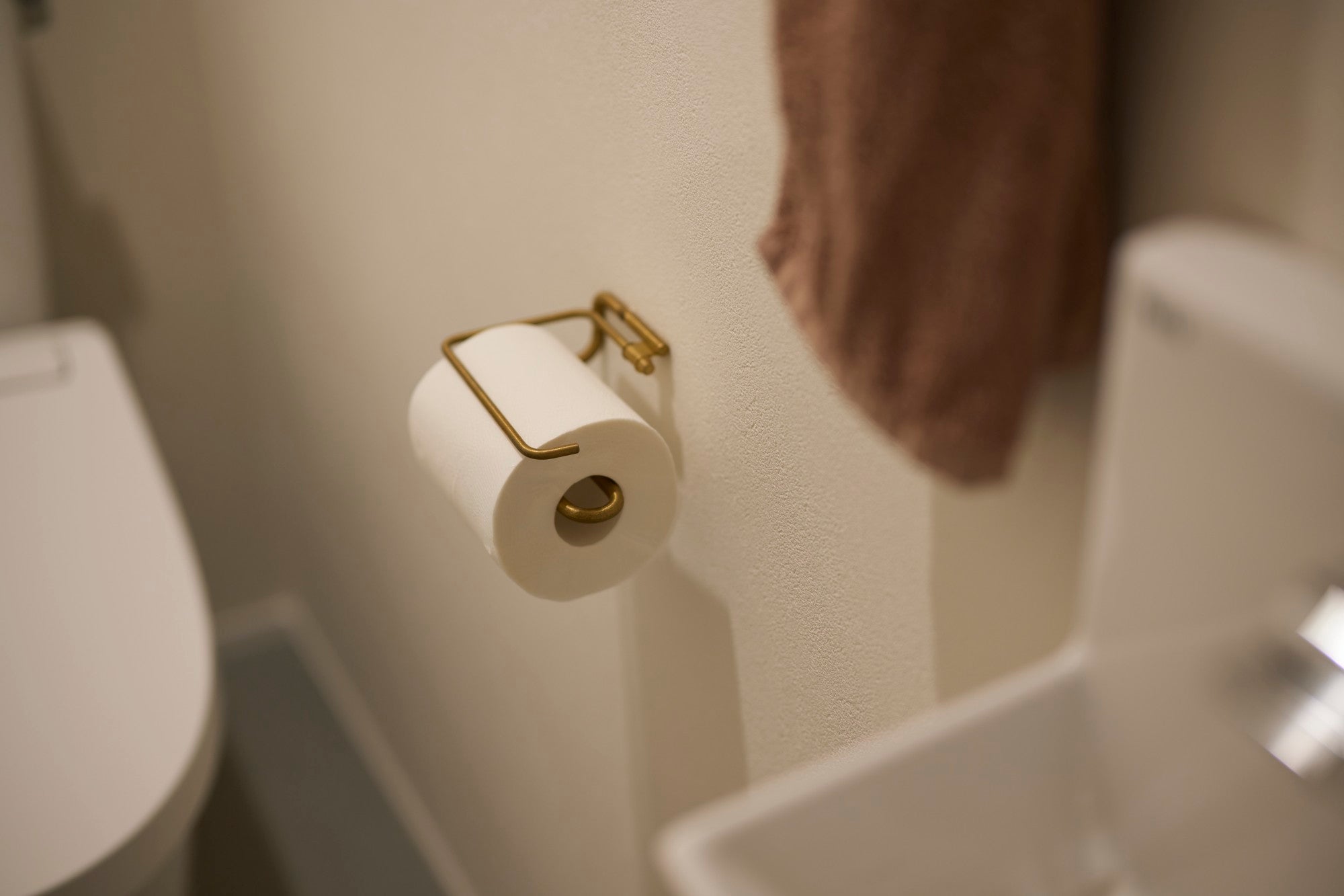 ペーパーホルダーの素材、タオルハンガーの形状、シェルフの配置、フックの素材感。