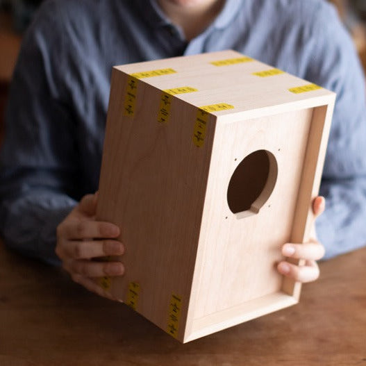 板×14枚/木工用ボンド×2本/紙やすり×2枚/自然健康オイル缶(ドイツ リボス社製)×1缶/オイル用白布×2枚(塗装用・拭き上げ用)/吸音材(フェルト)×2枚/スピーカーネット(黒)×2枚/スピーカー接続ケーブル×2本/スピーカー接続ターミナル×2個/ターミナル取付ネジ×4本/真鍮エンブレム×2個/塩ビパイプ(グレー・直径38.5mm)×2本/隅木(三角棒)×8本