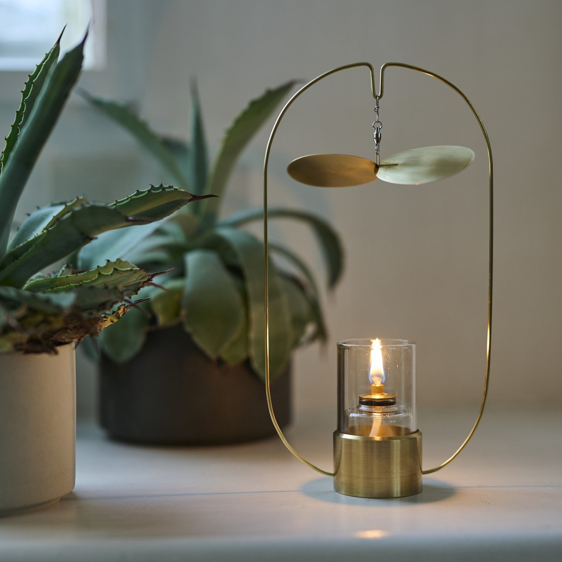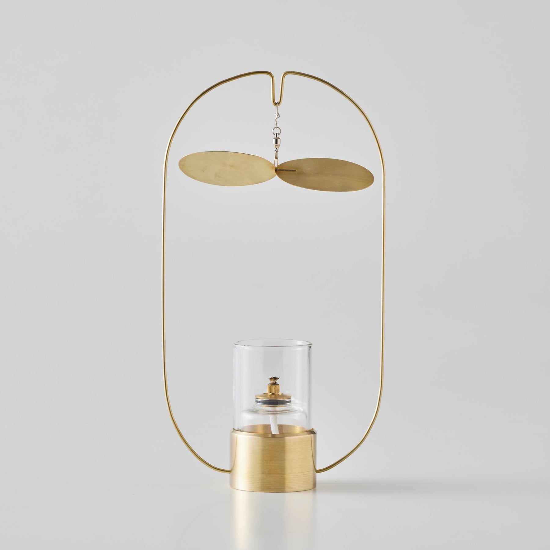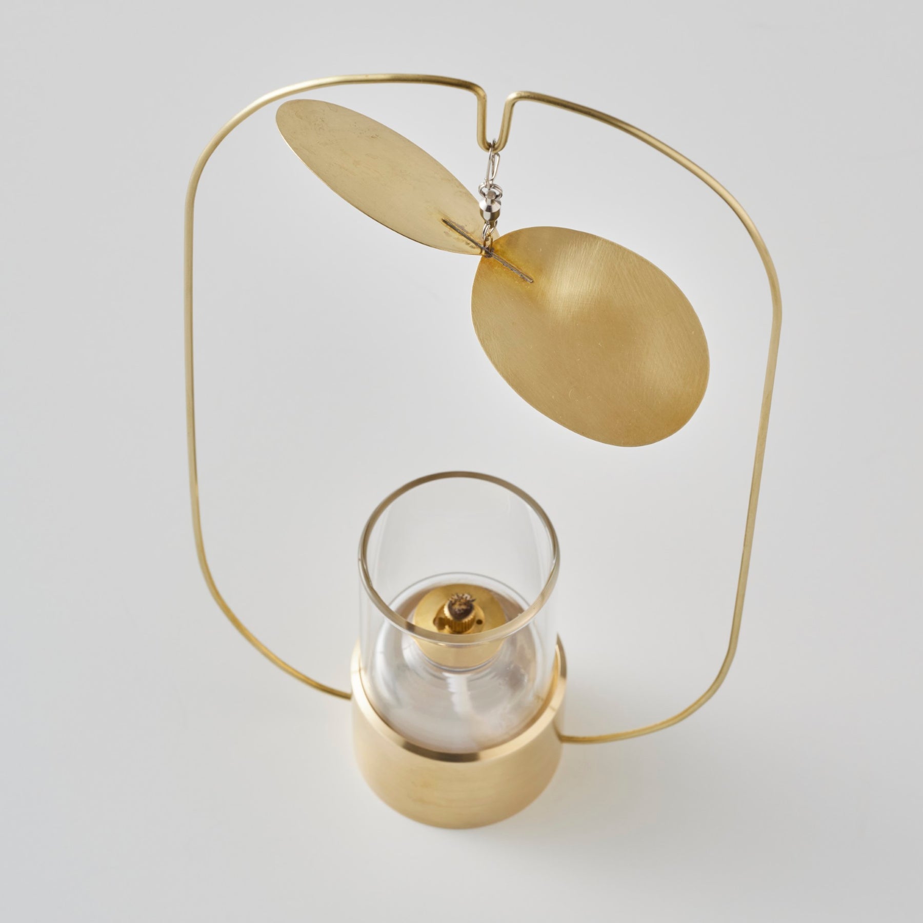 こちらの Turning Lamp mini は炎の熱によって発生する気流をとらえて、真鍮の羽根をゆっくりと旋回させるオイルランプ。