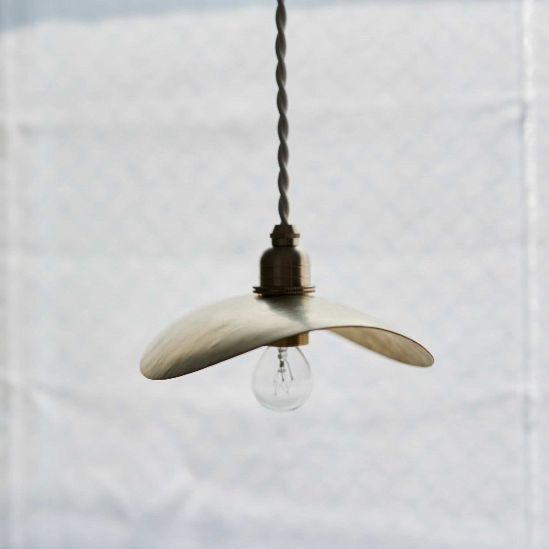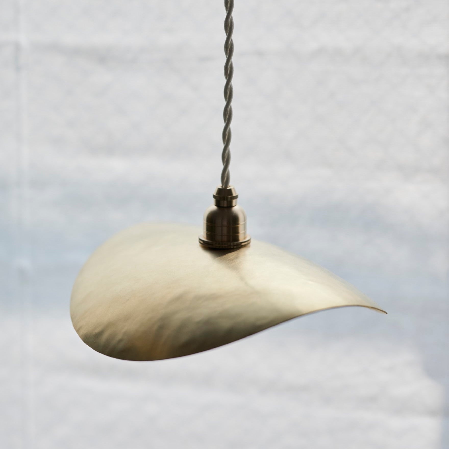 この真鍮のシェードは、一枚の素材を高温で熱し、金槌や木槌で何度も叩いて成形されたもの。