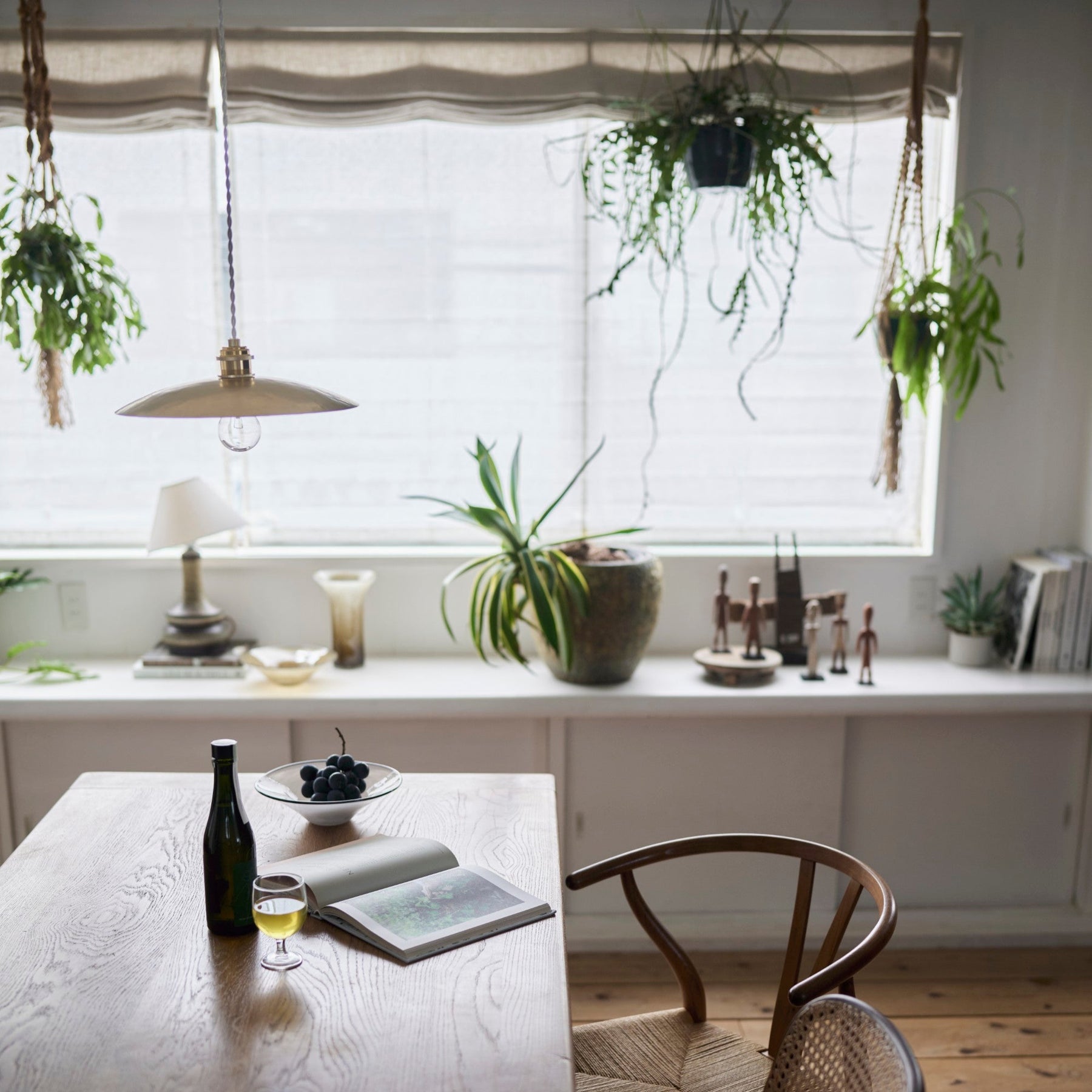 テーブルに並ぶ器、棚に置いた植物、ソファの上で開く本。