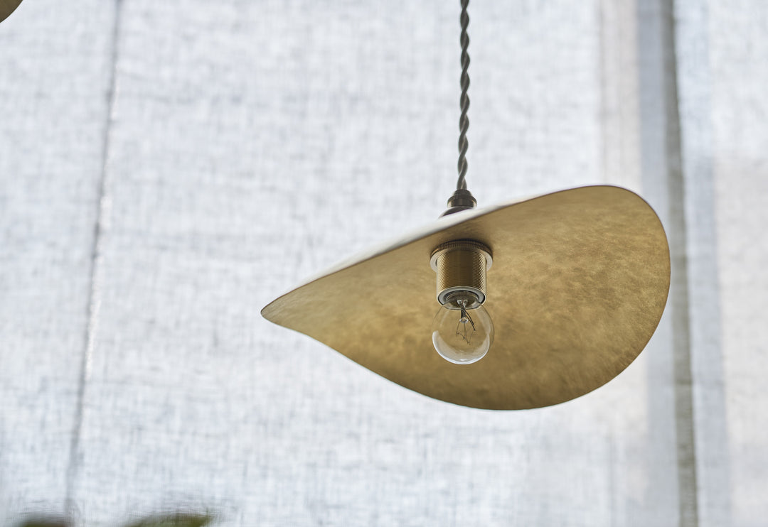日中は素地のままの真鍮が光を受けて明るいアクセントとなり、夜に灯りをともせば、シェードの内側に反射する光がやさしい陰影を描き出します。