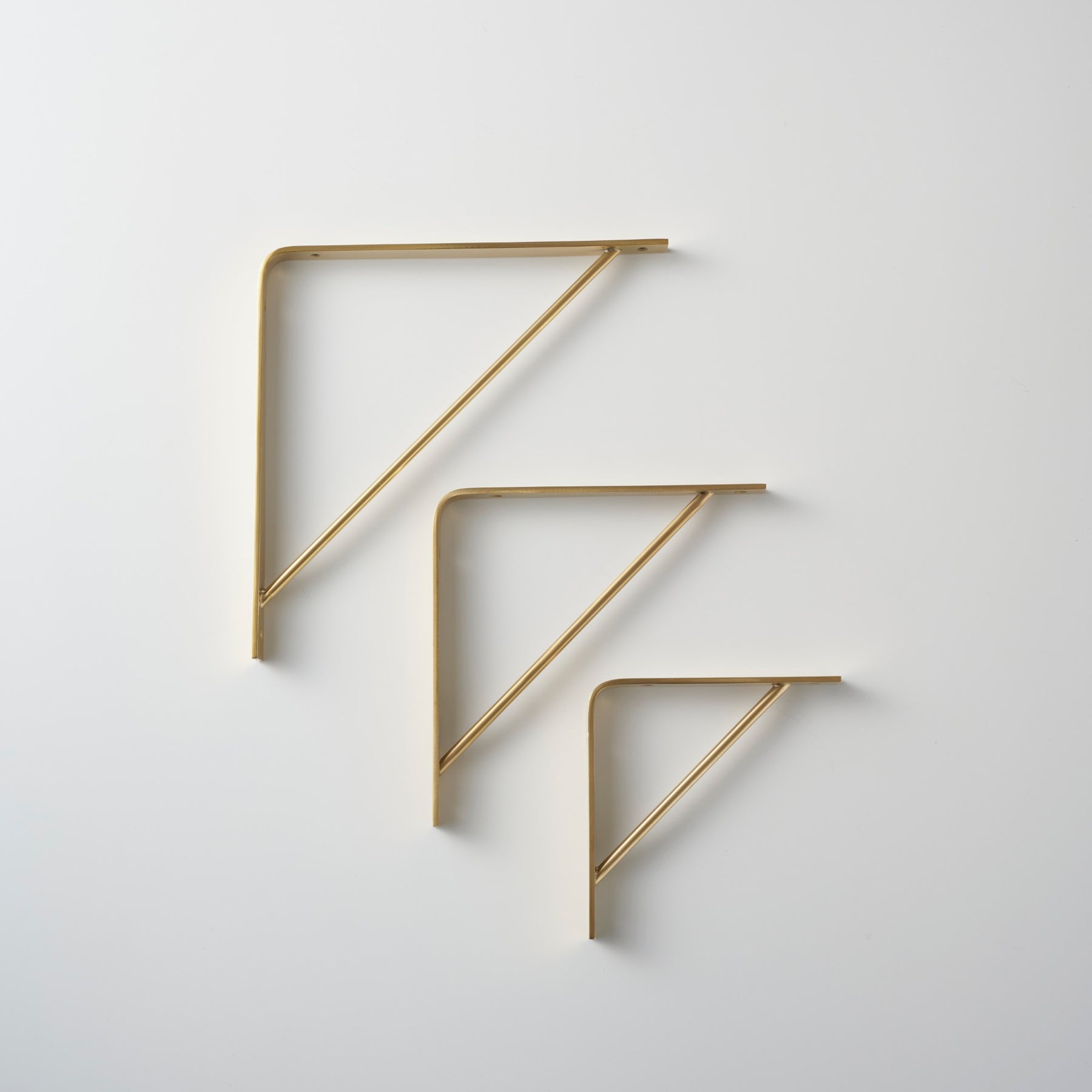 細身で柔らかなフォルムの棚受け金具は、シンプルながらも真鍮ならではの上質な存在感を放ちます。