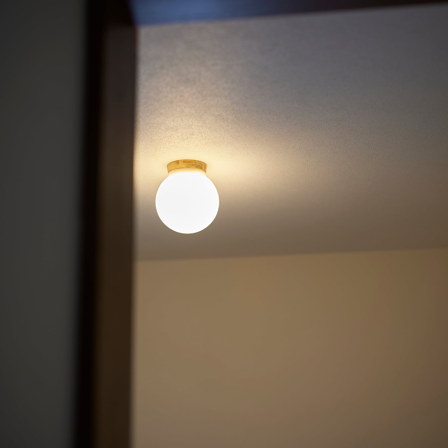 Globe エントランスライトは、真鍮の台座とホワイトガラスシェードの美しいコントラストが印象的な、壁・天井両用の照明器具です。