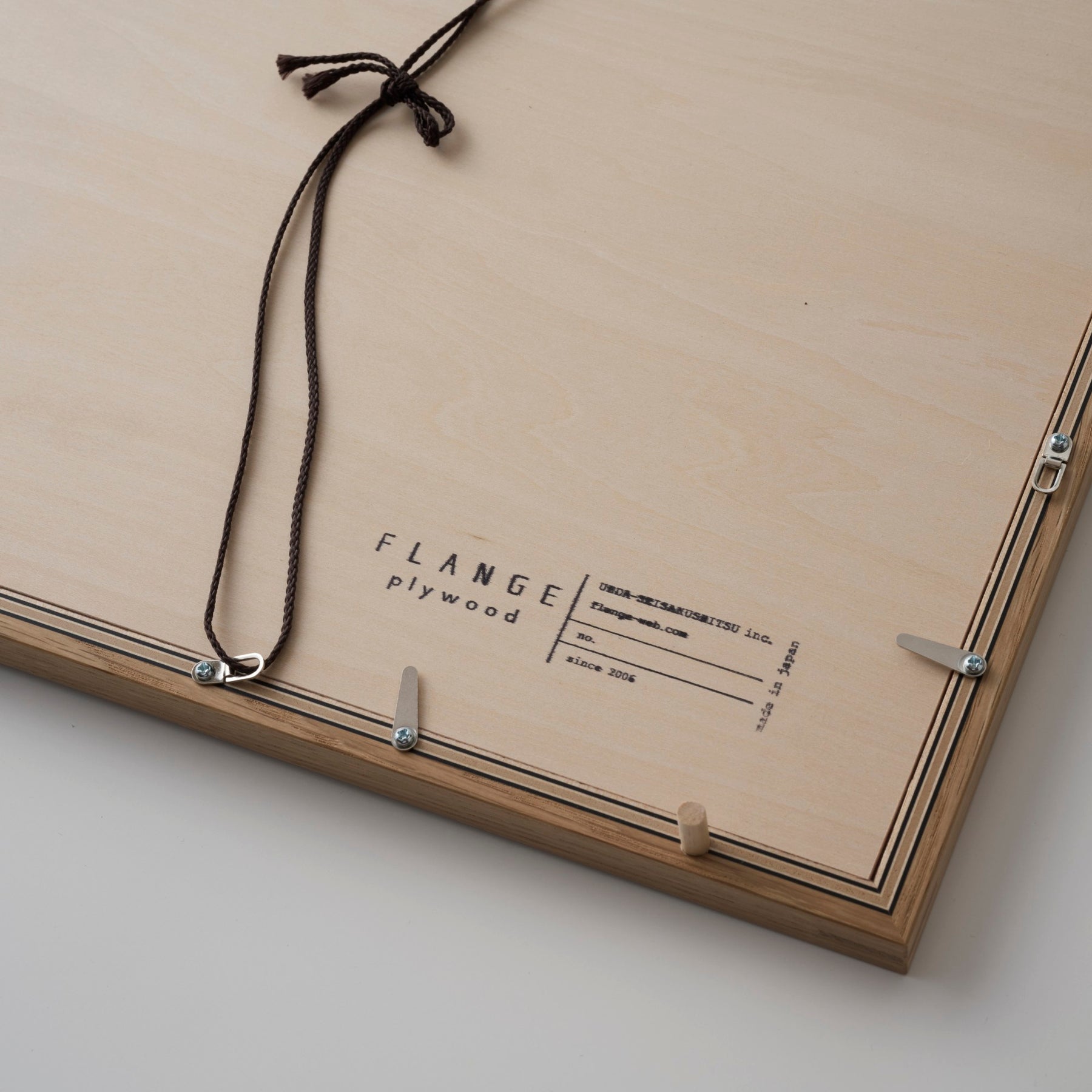 FLANGE plywood のフレームは、積層合板を丁寧に重ねて仕立てられ、ウォールナットの端正な木目がポスターの魅力を際立たせます。