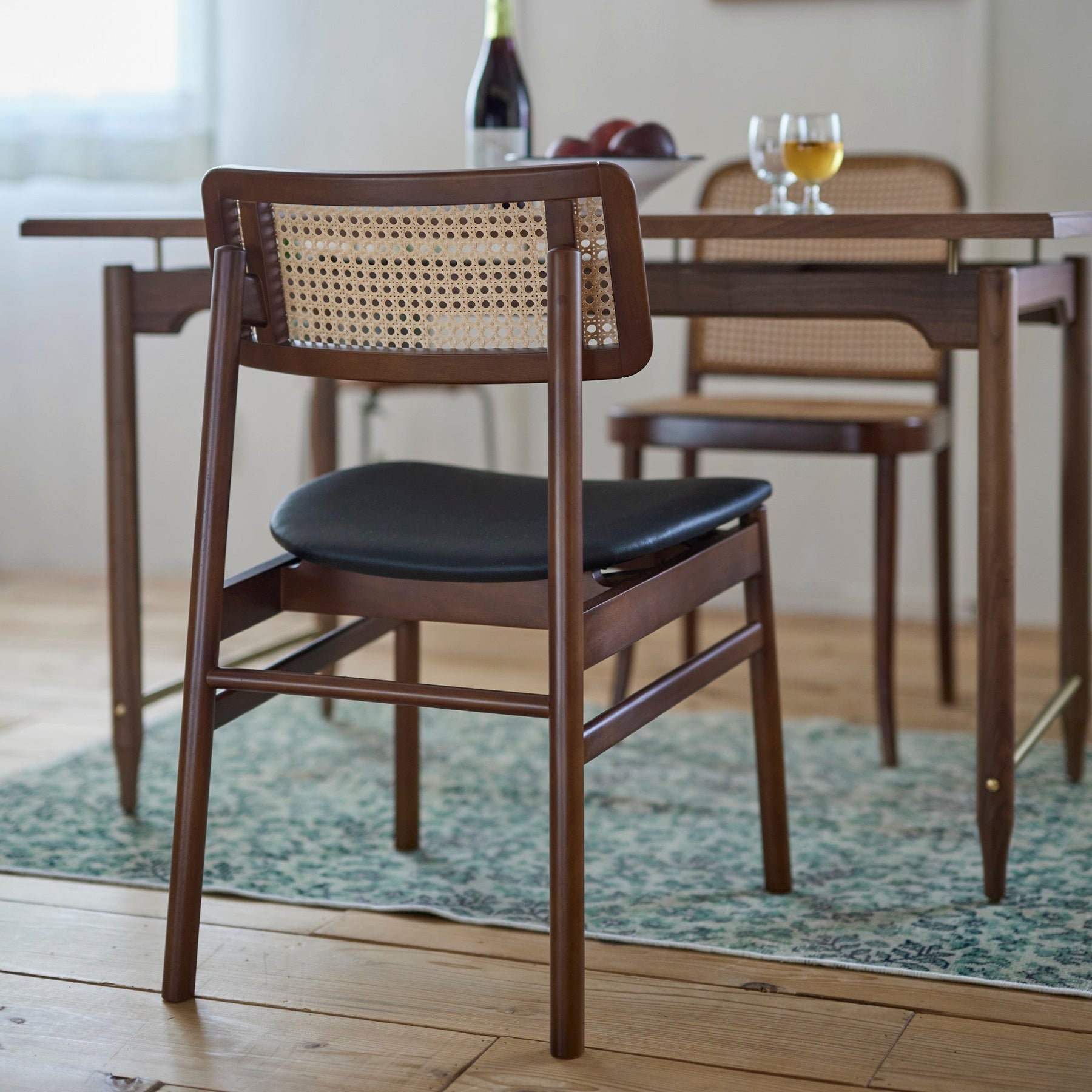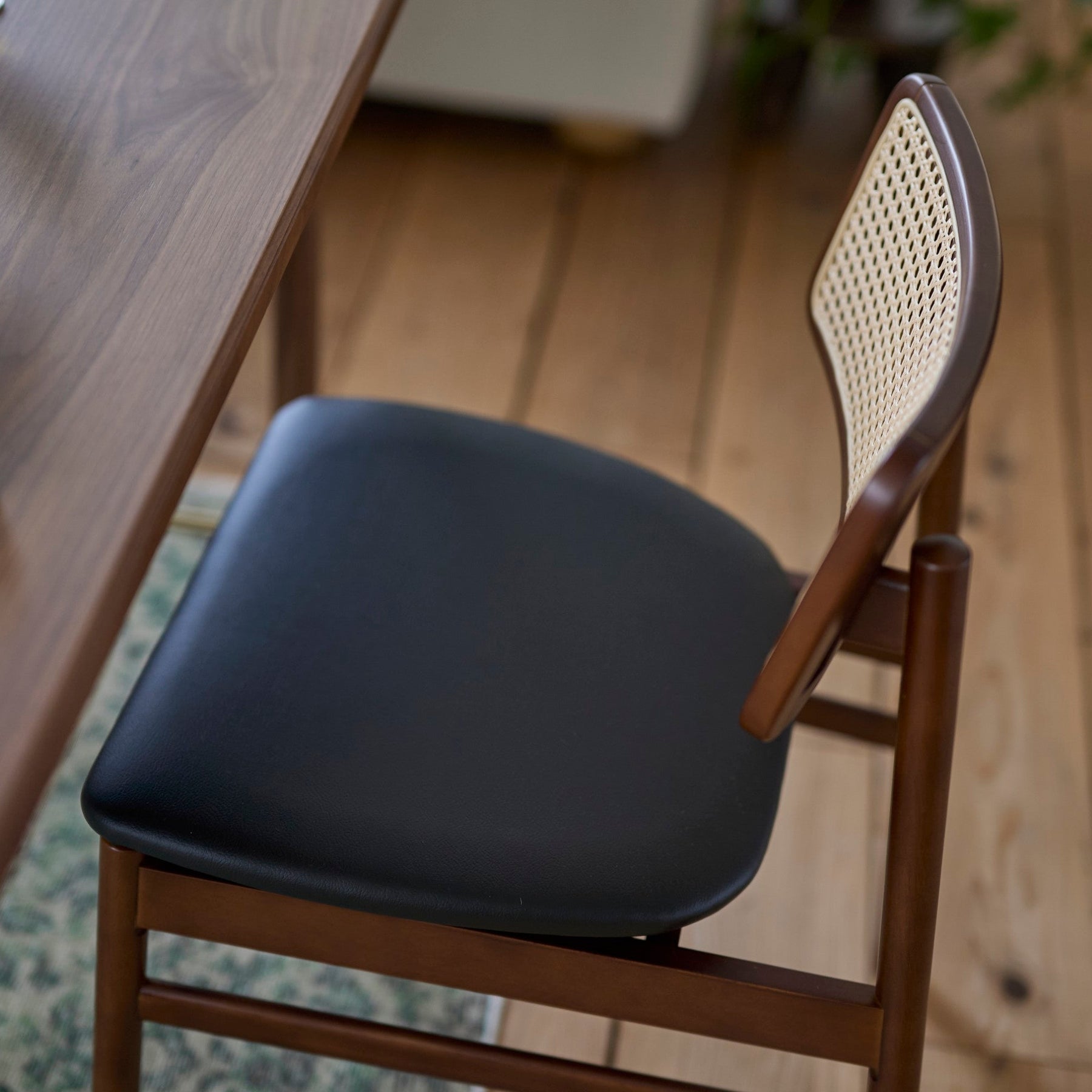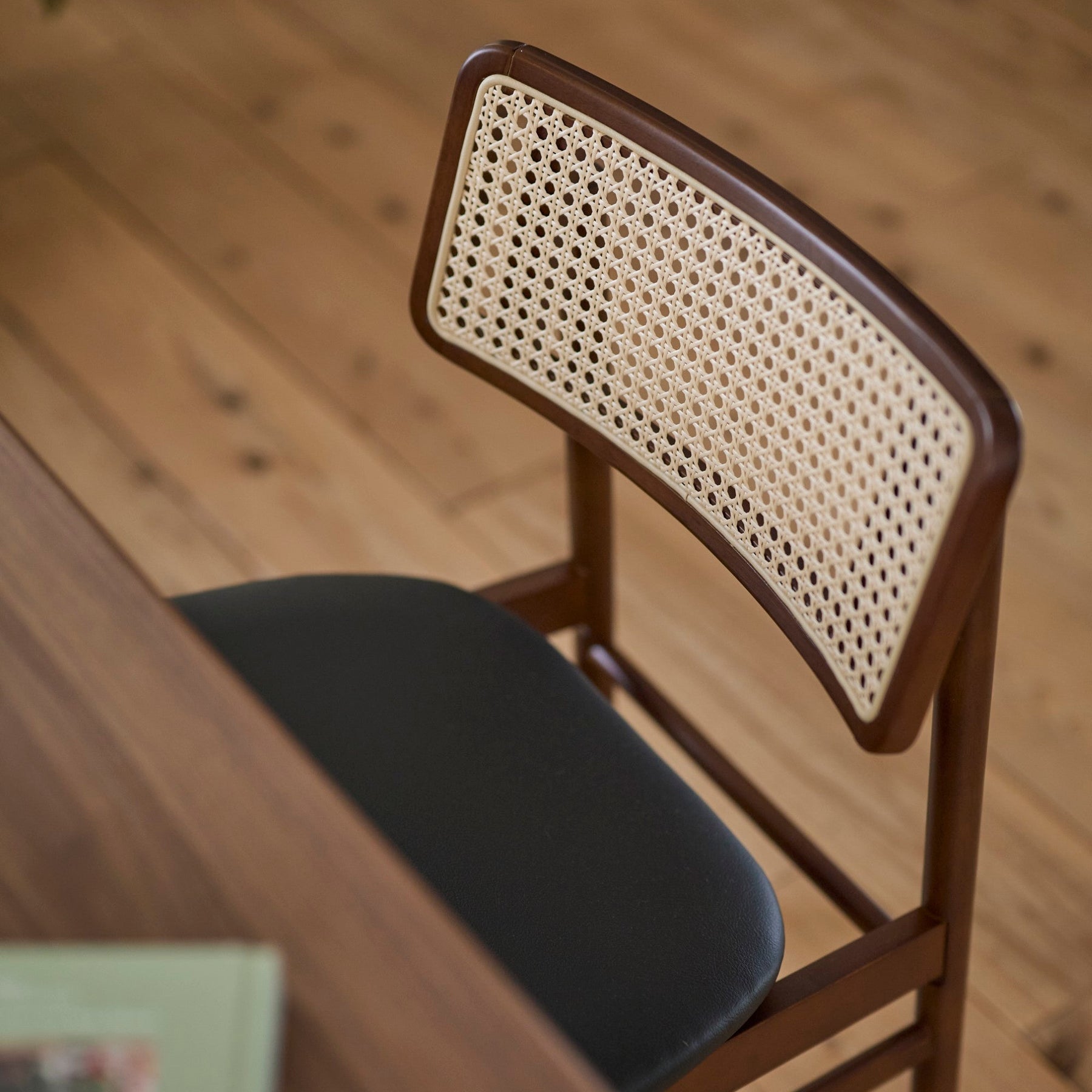 背もたれに施されたかごめ編みのラタンが、レトロな空気感と現代的なセンスを調和させています。