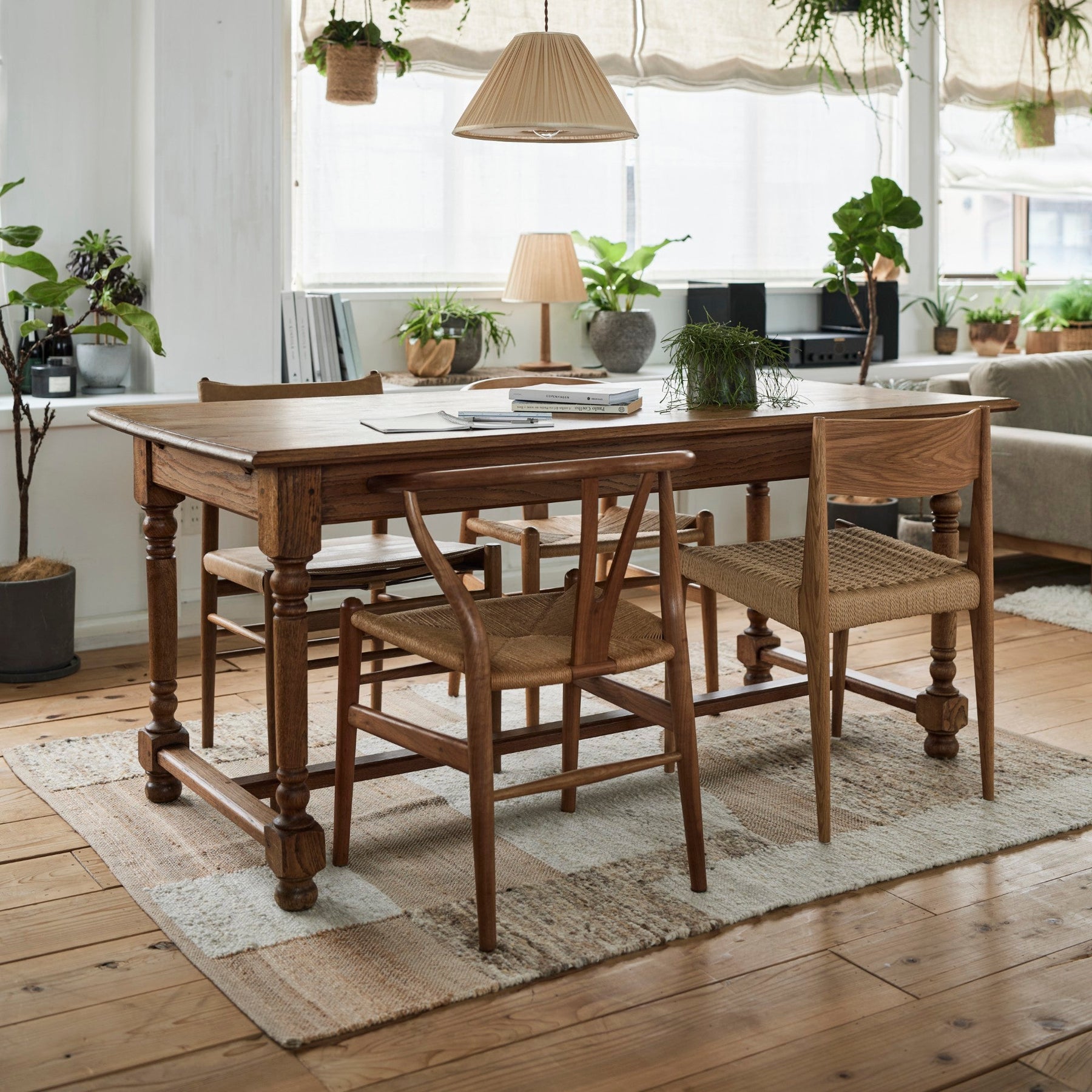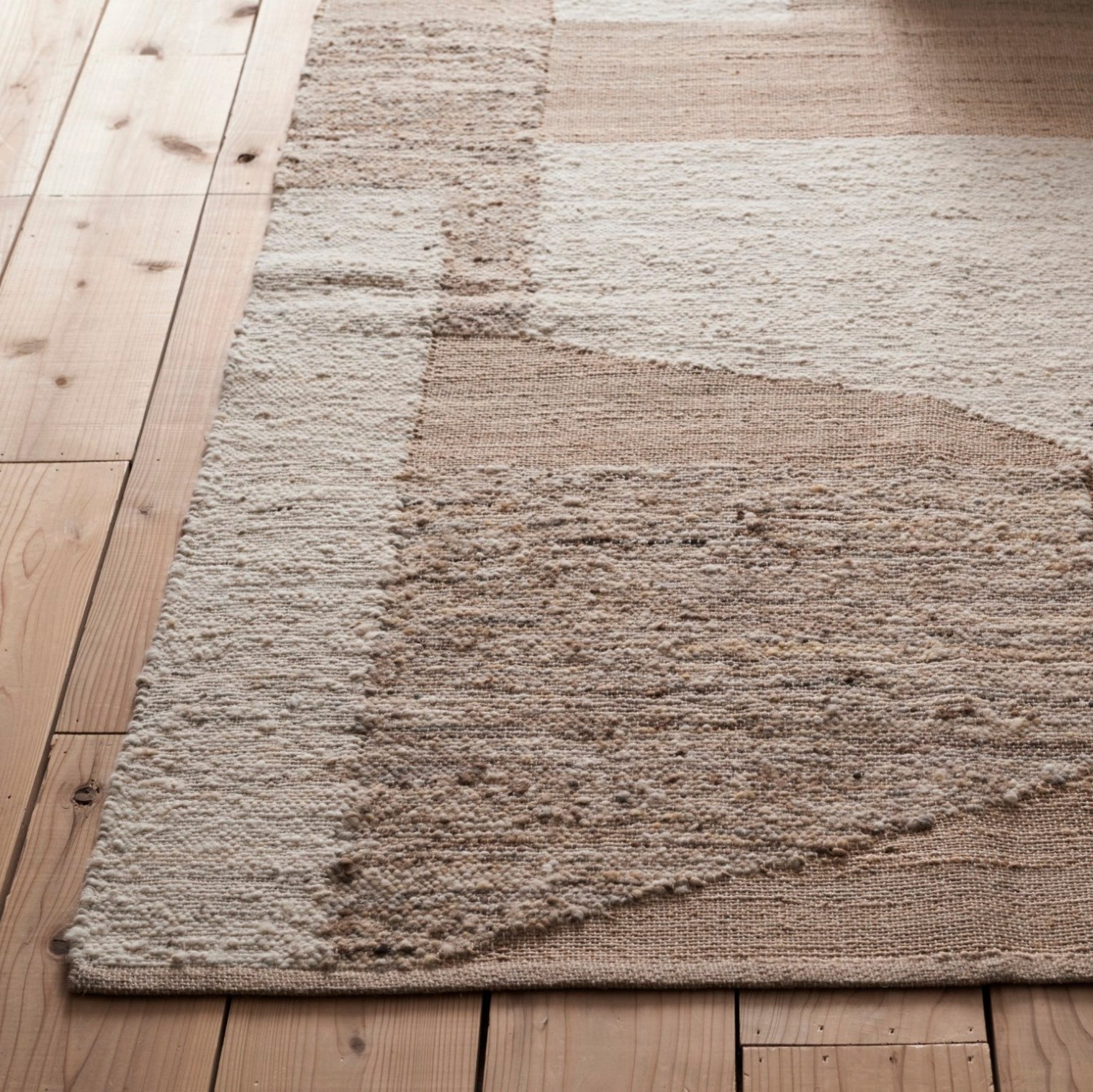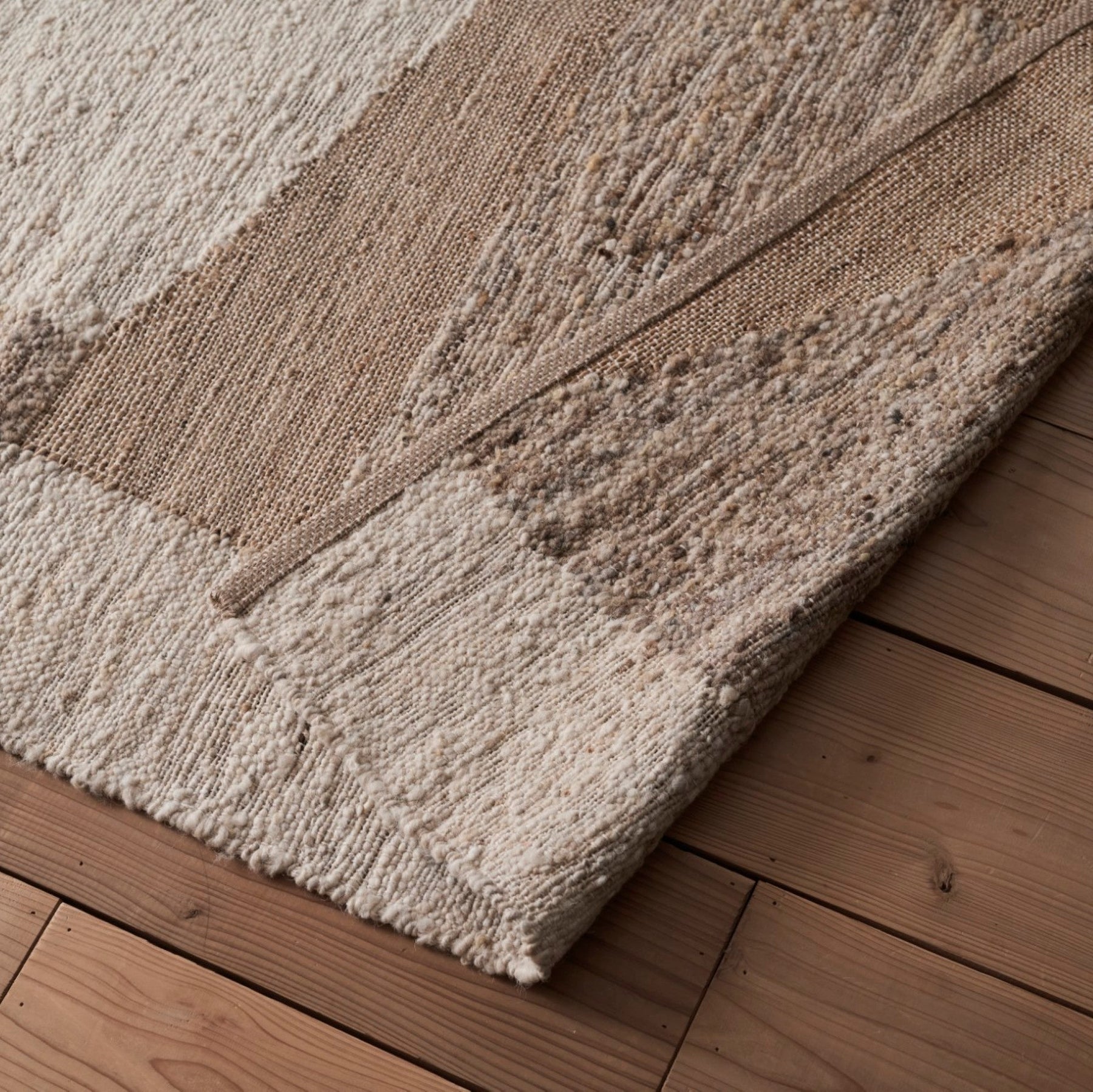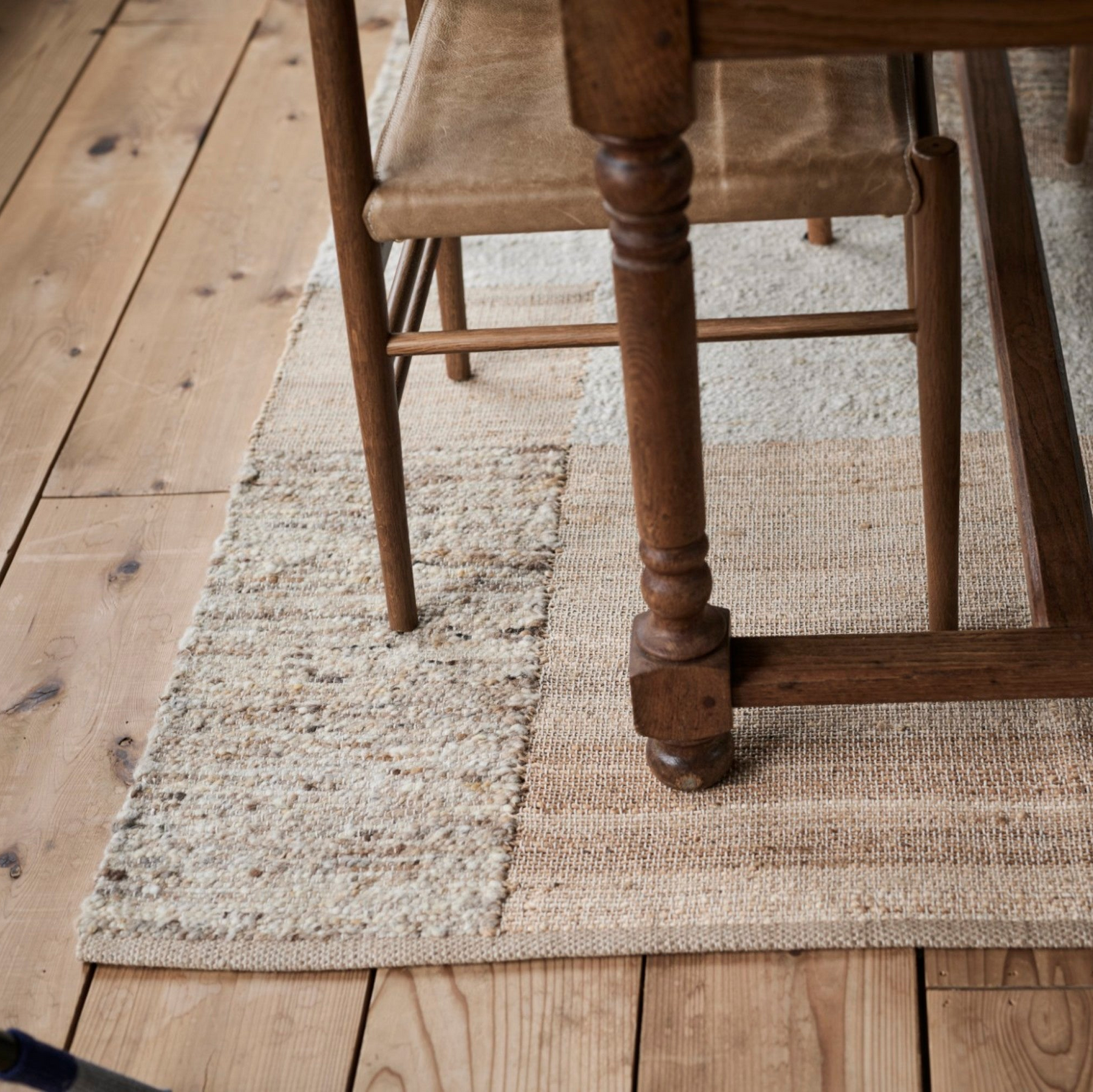 ヘンプ特有のキリリとした質感と、ウールのふんわりとした風合いが一枚のラグの中で共存する様は、まるで小さなアート作品のよう。