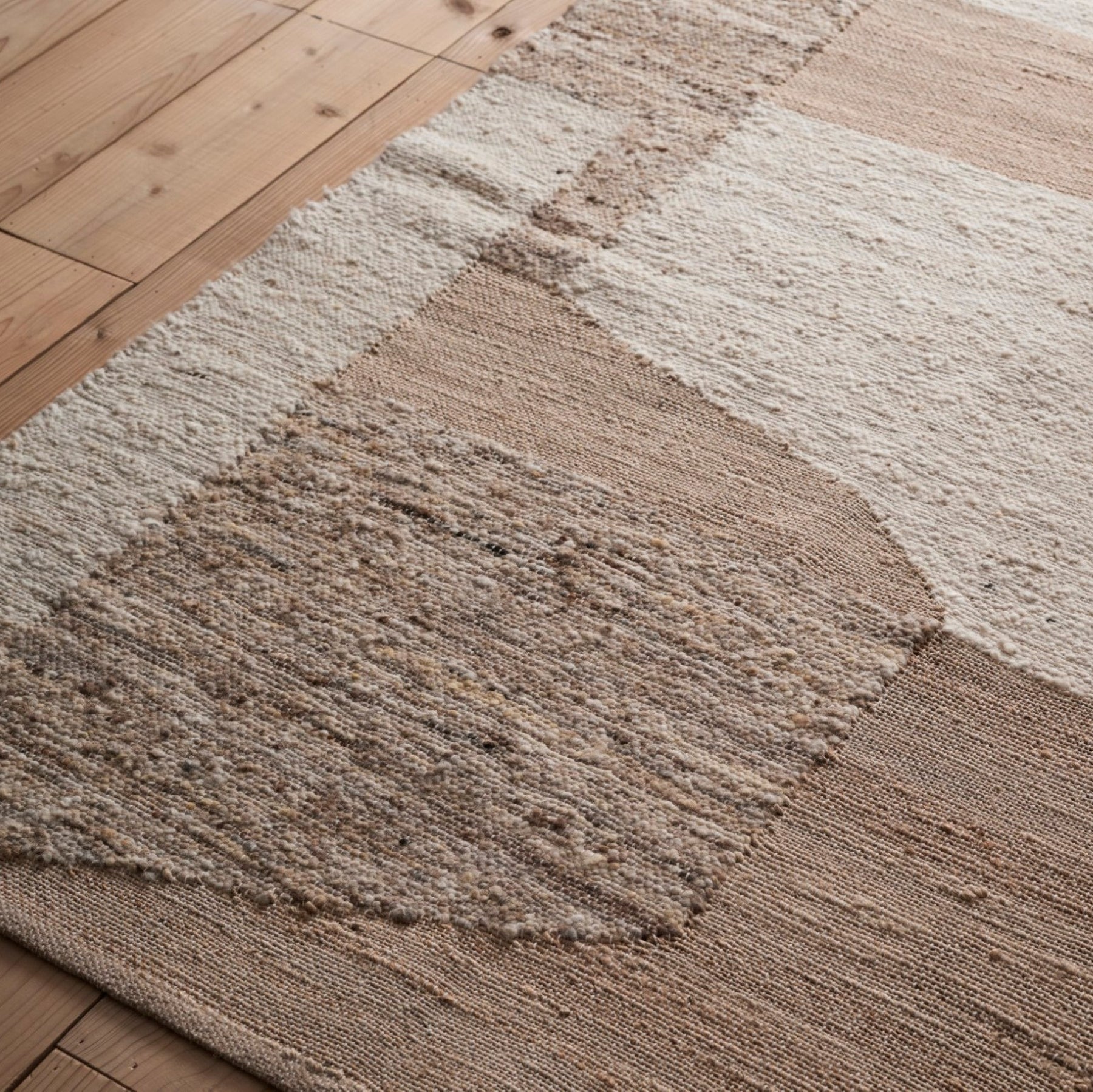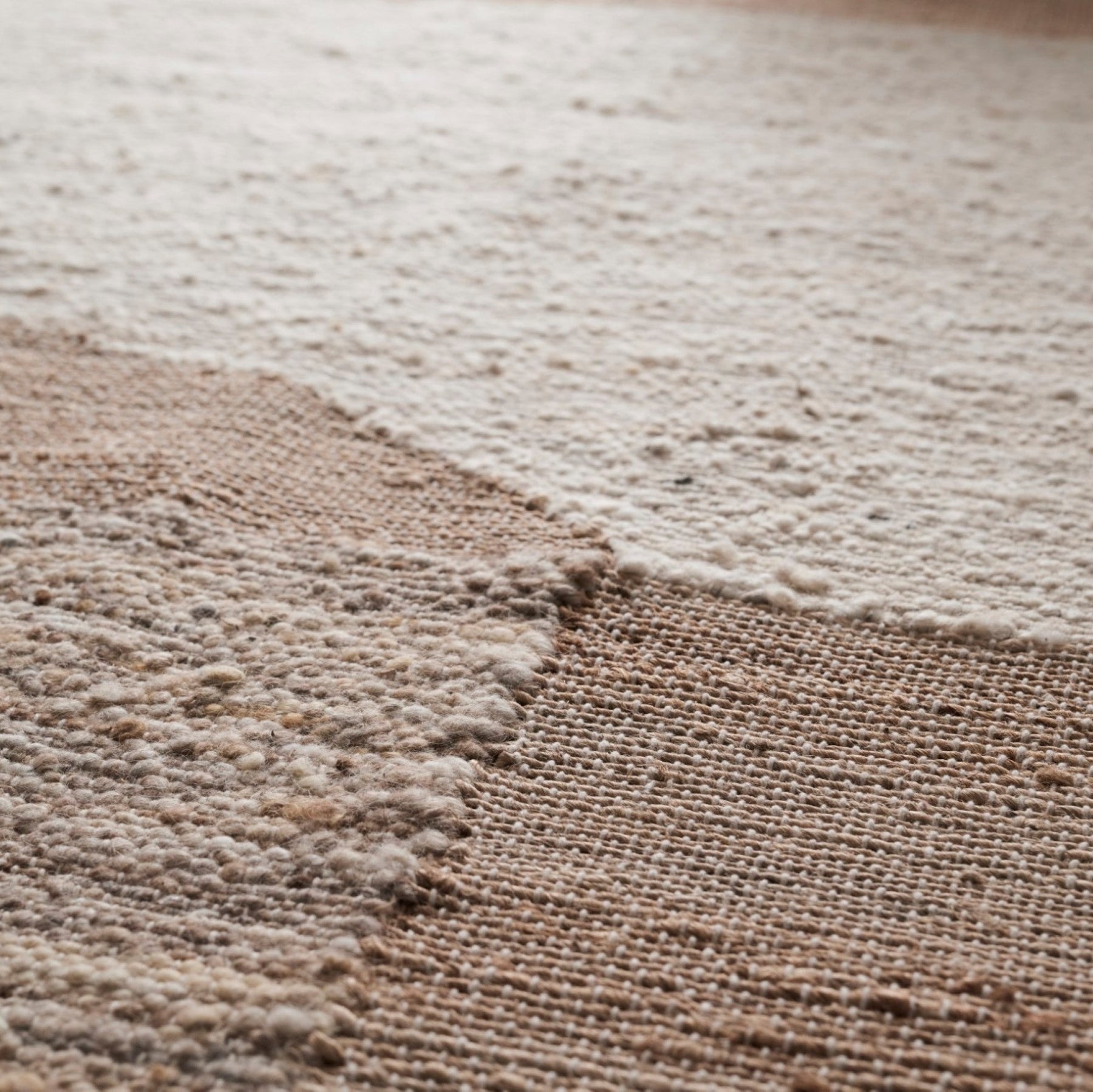 BURT ラグマットは、パッチワークのように組み合わされた素材の対比が、シンプルながらも奥行きのある表情を見せてくれます。