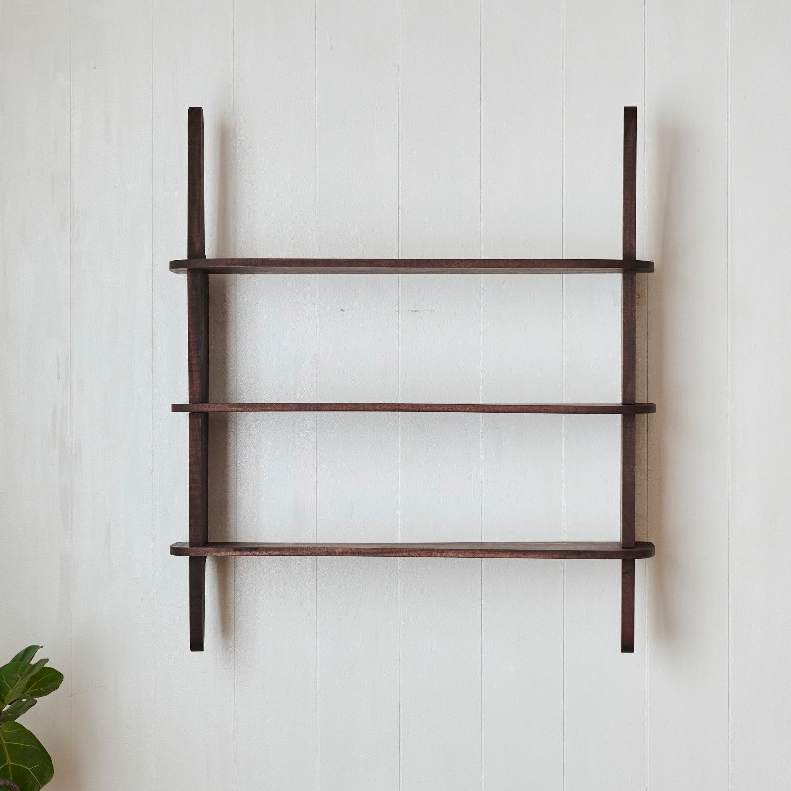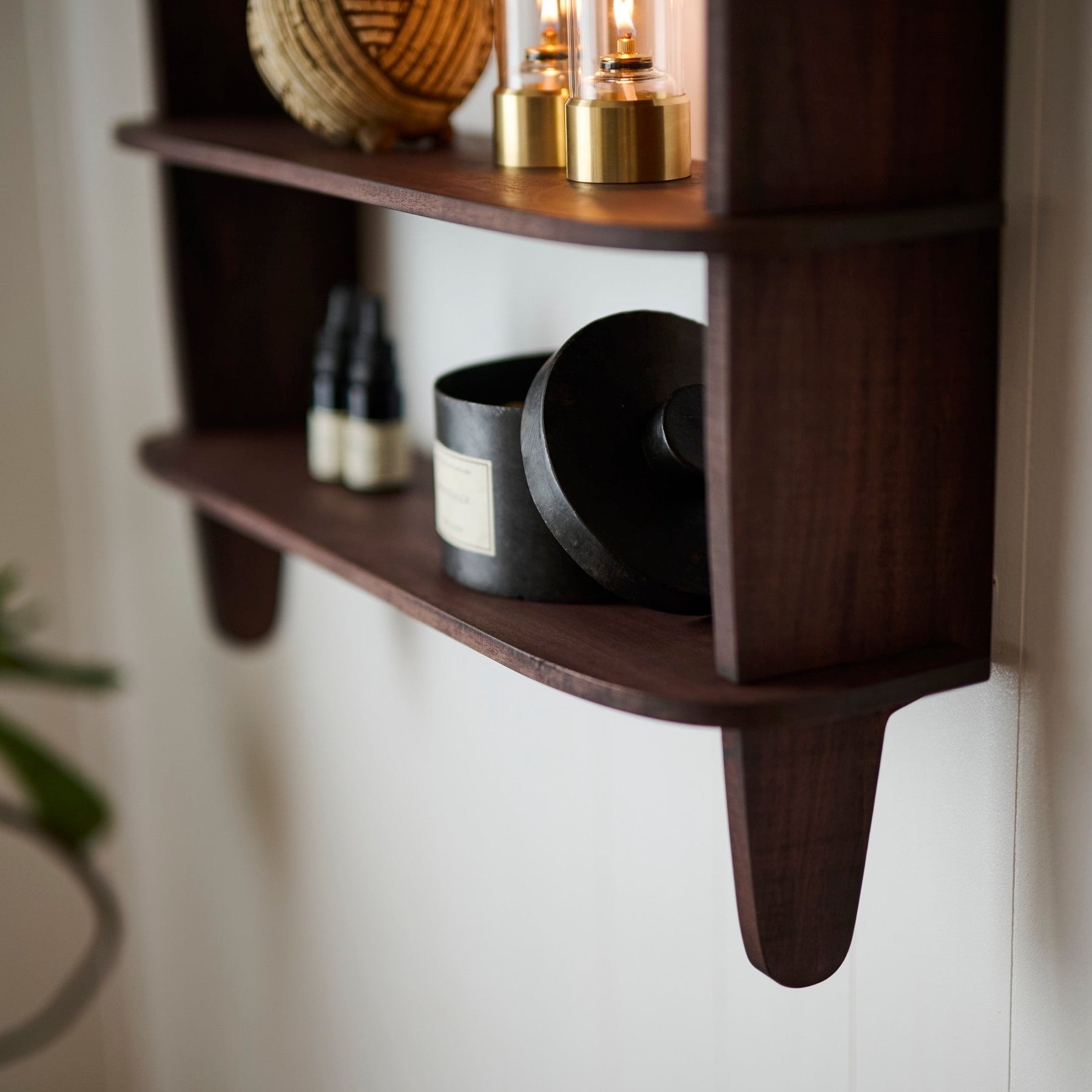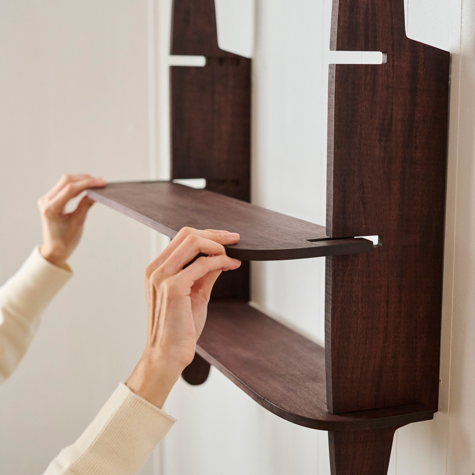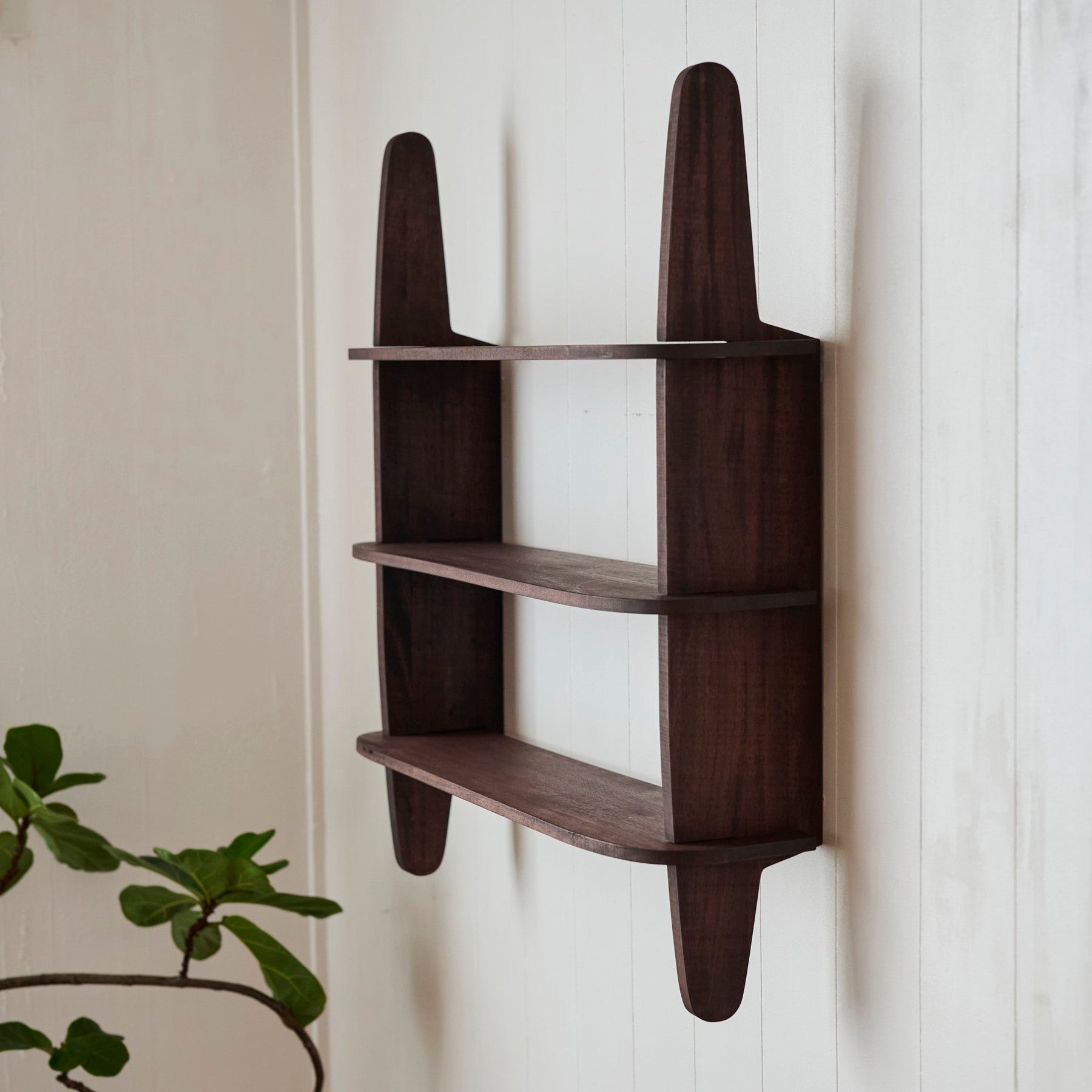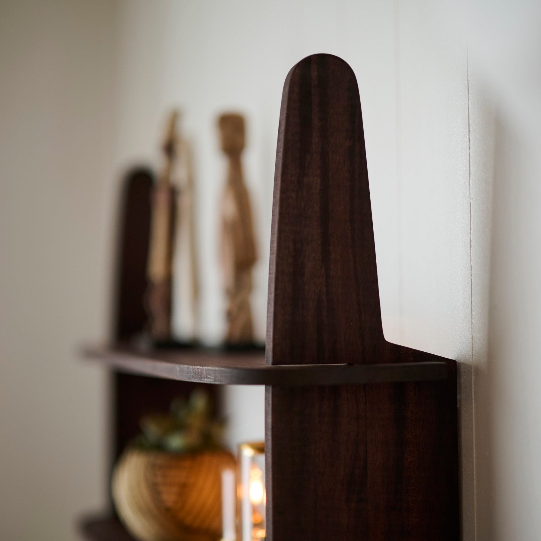 背板を設けず、棚受けを緩やかにカーブさせることで、壁面に軽やかな余白が生まれます。