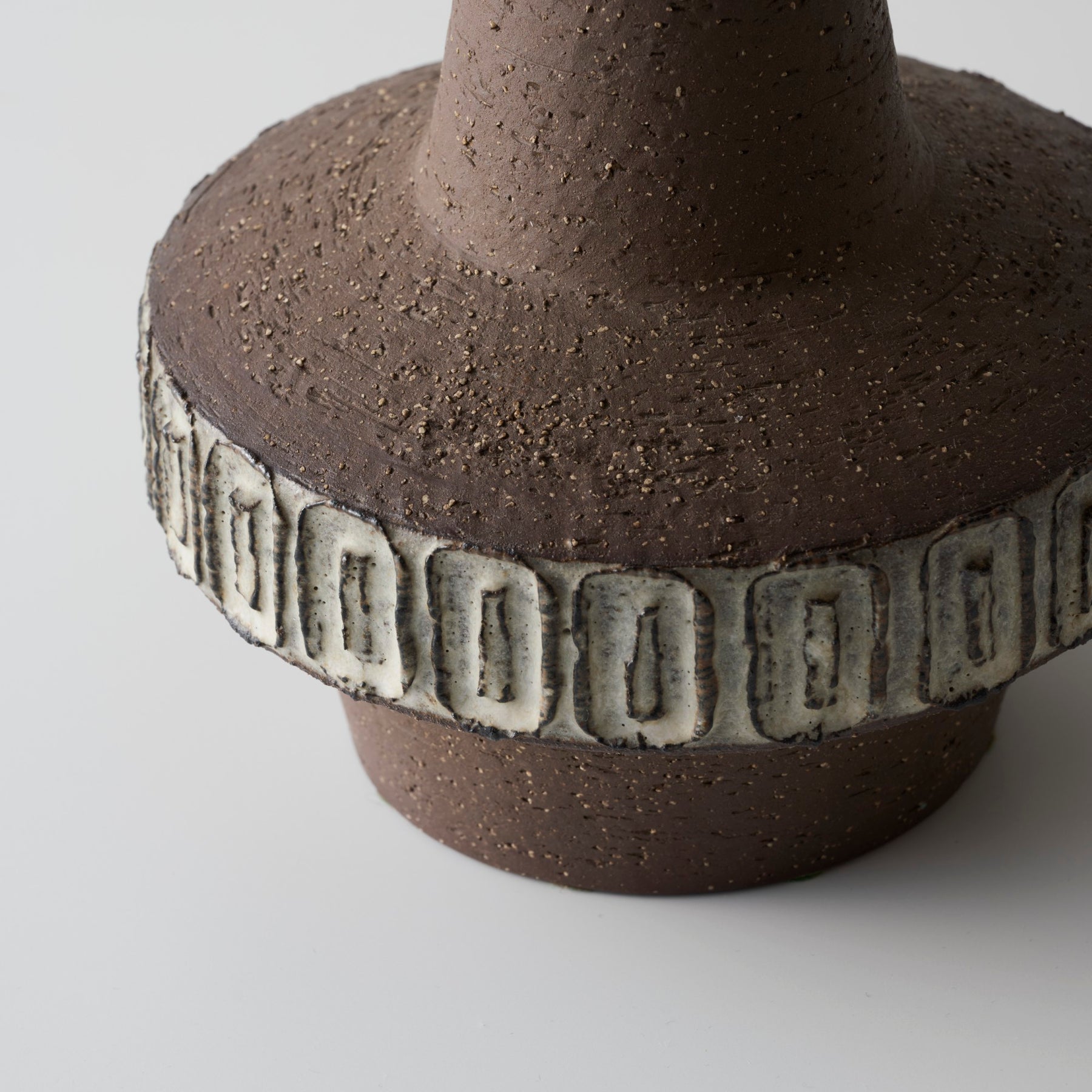 本体は細長いシルエットからゆるやかに膨らむフォルムが特徴的で、下部を飾る幾何学模様がアクセントとなり、落ち着きの中にもリズムを生み出しています。
