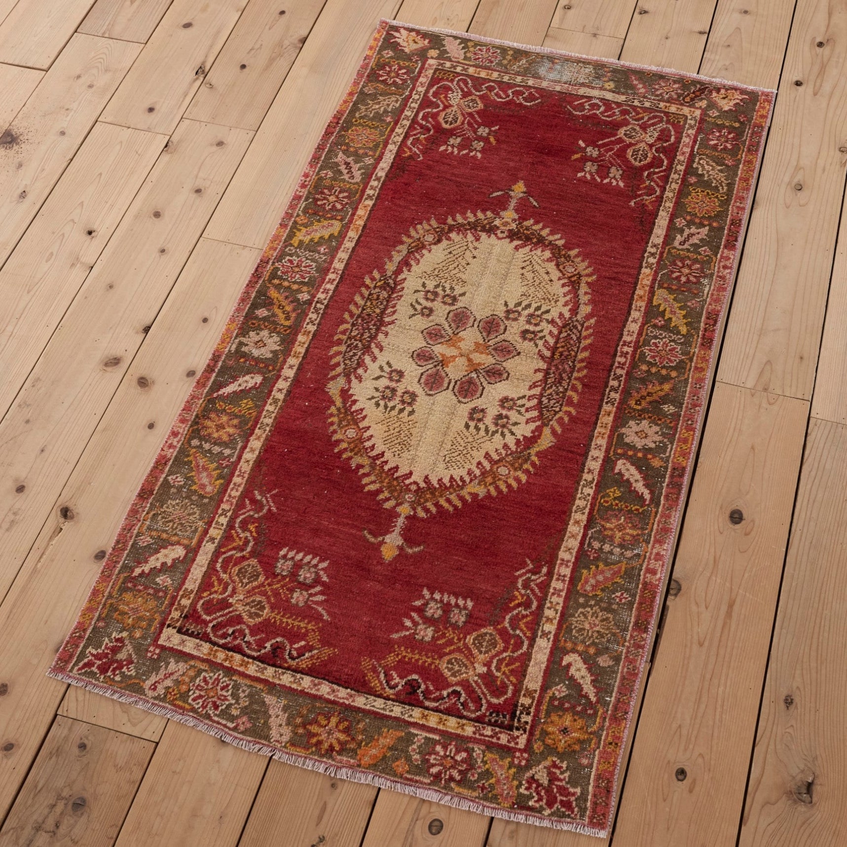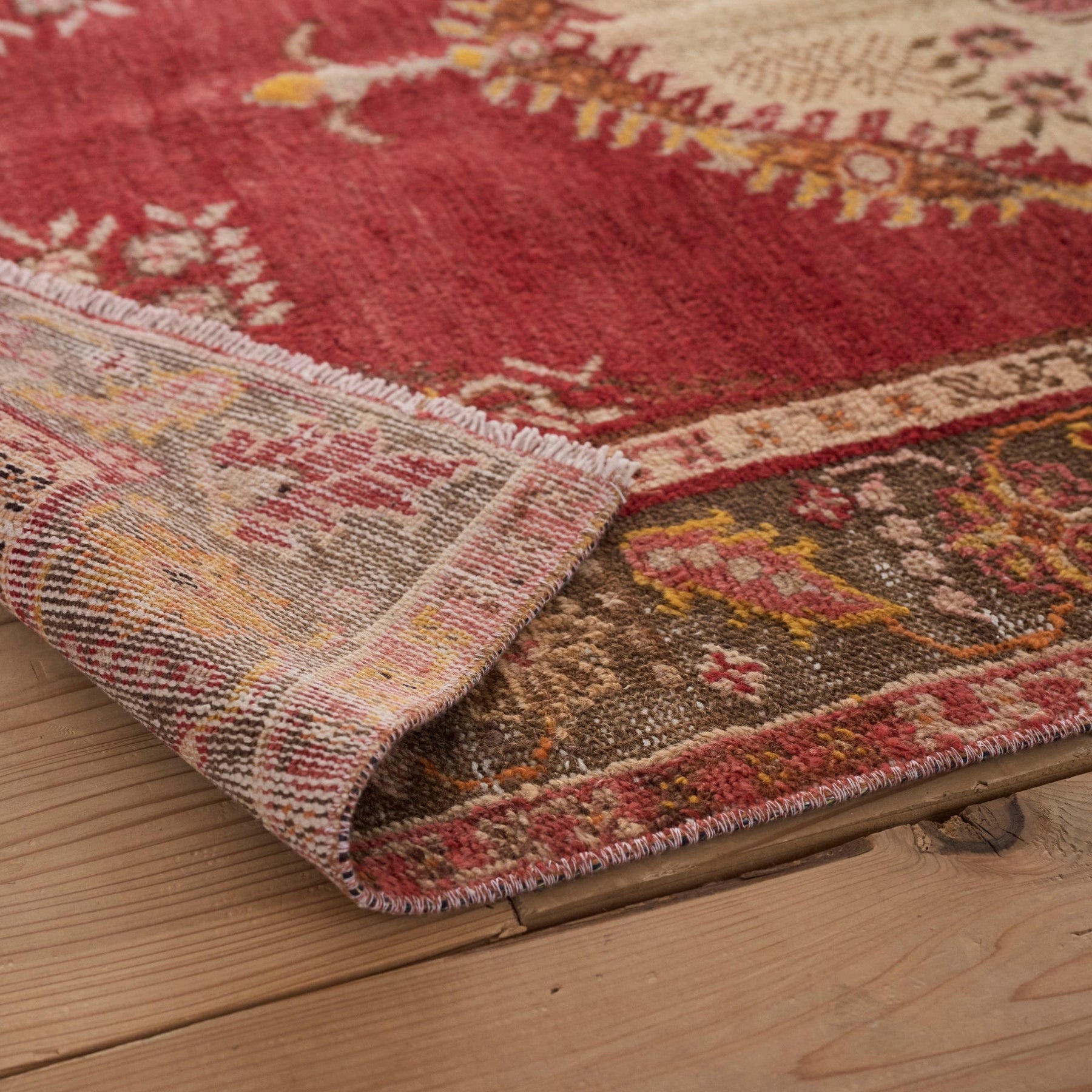 中央の楕円形メダリオンやボーダー部分にあしらわれた花のモチーフは、自然への愛情を象徴しており、深いレッドを基調とした色彩は、当時の職人が込めた想いを映し出すかのよう。