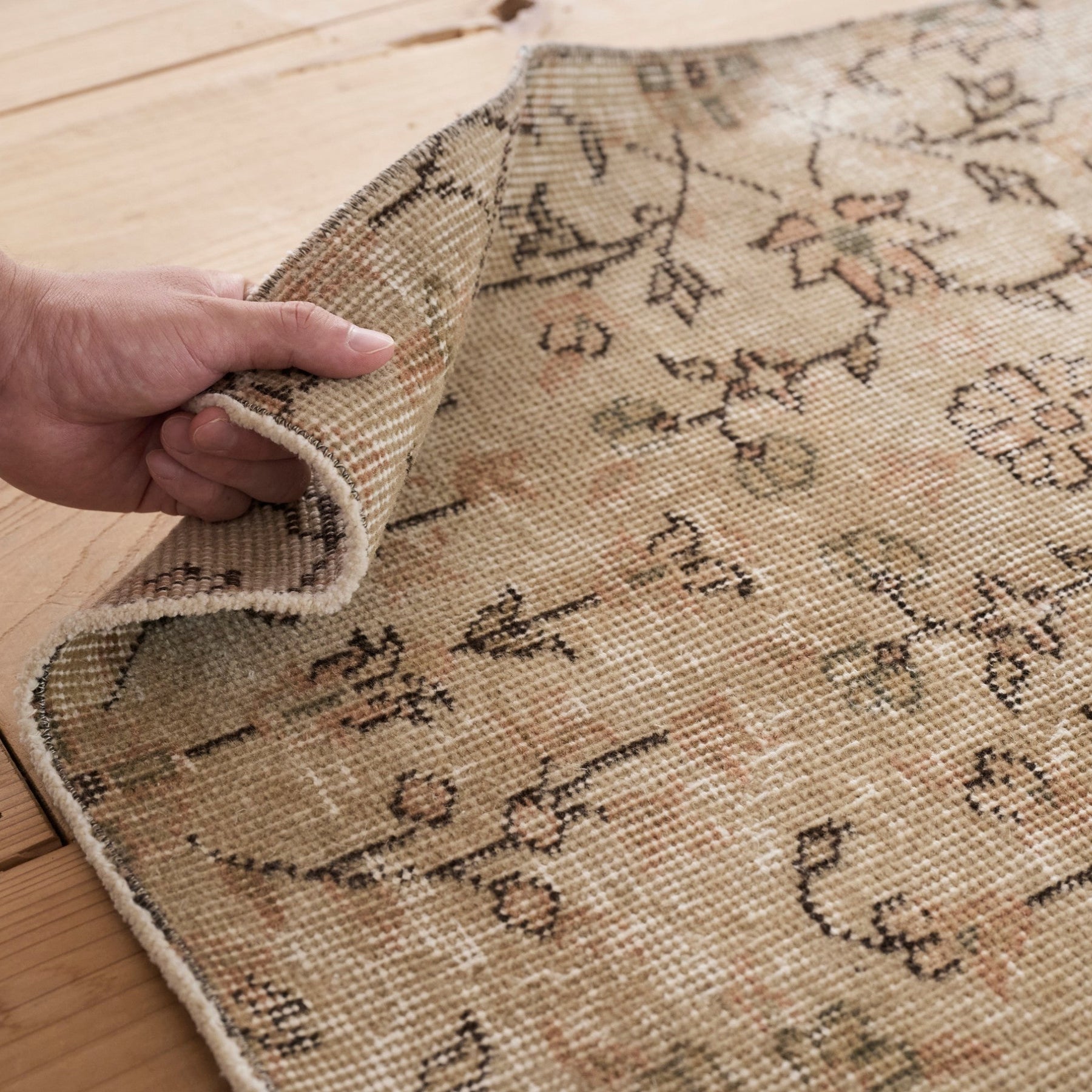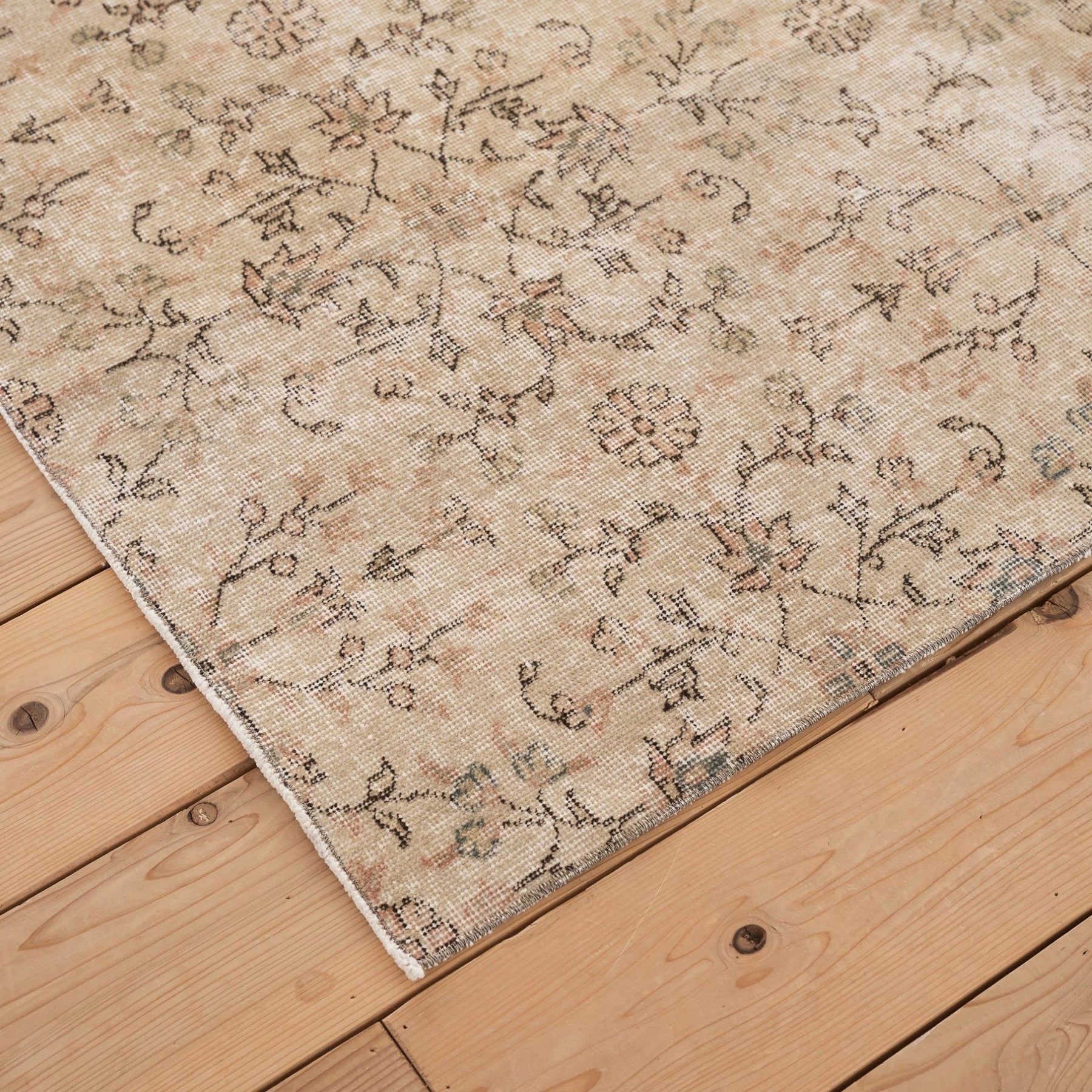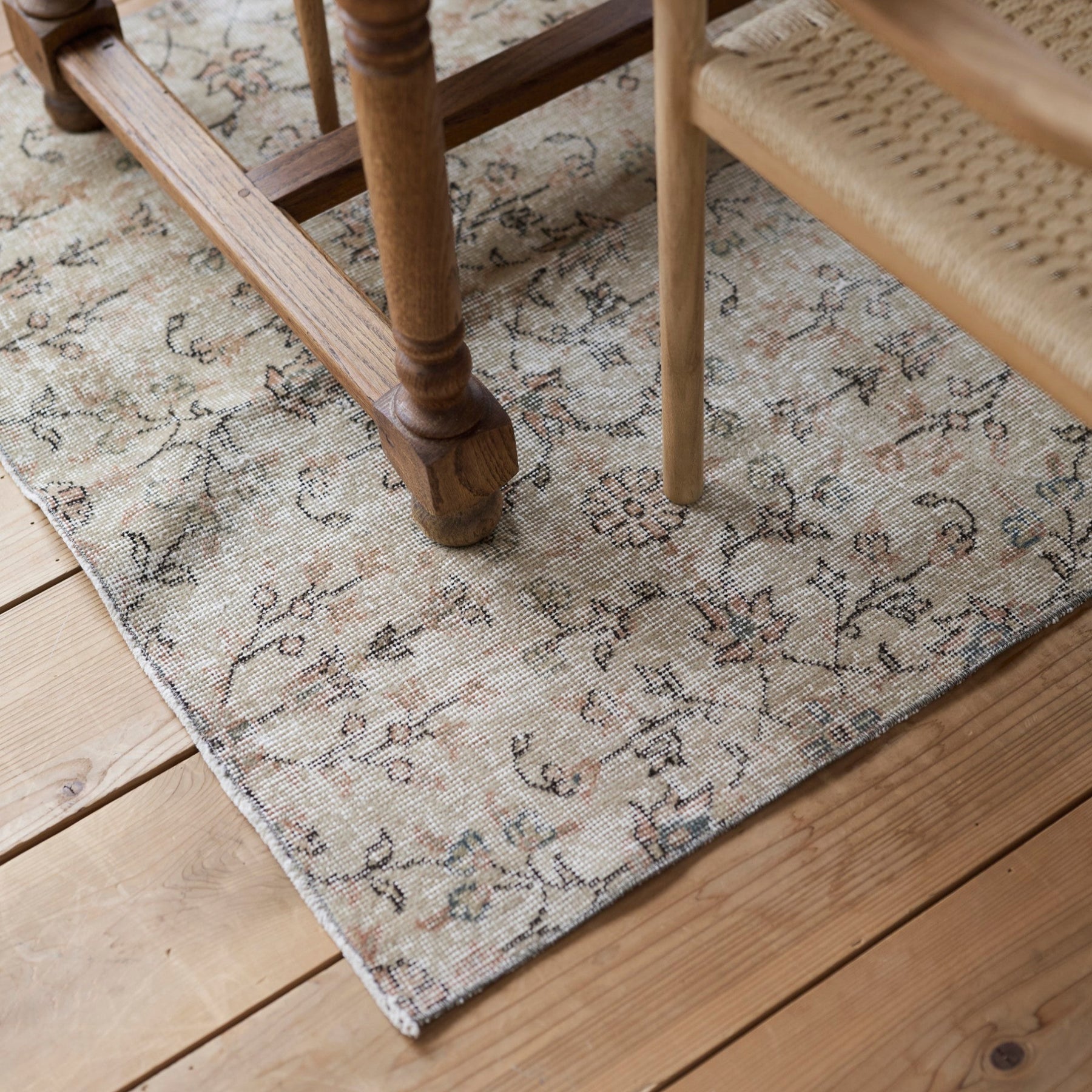 繊細な唐草模様と花柄が霞むように広がり、部分的に生まれた色の濃淡が、このラグだけの表情を描いています。