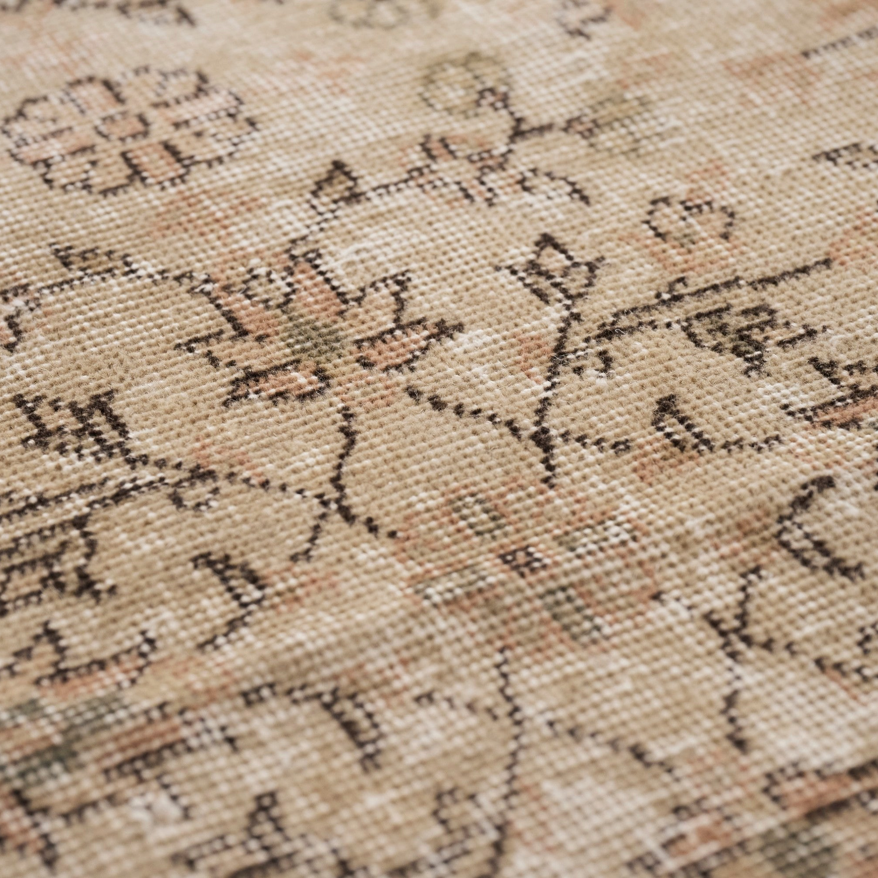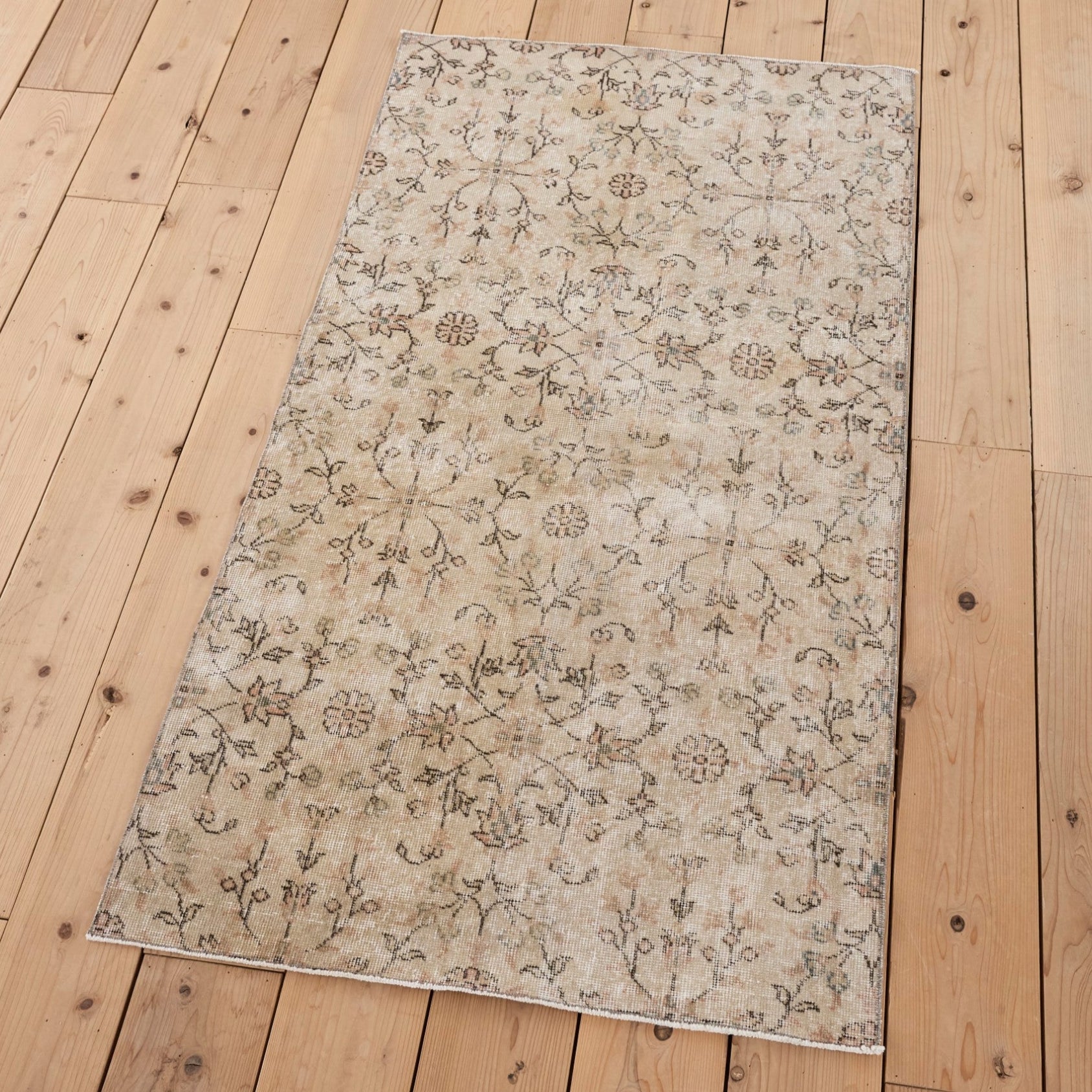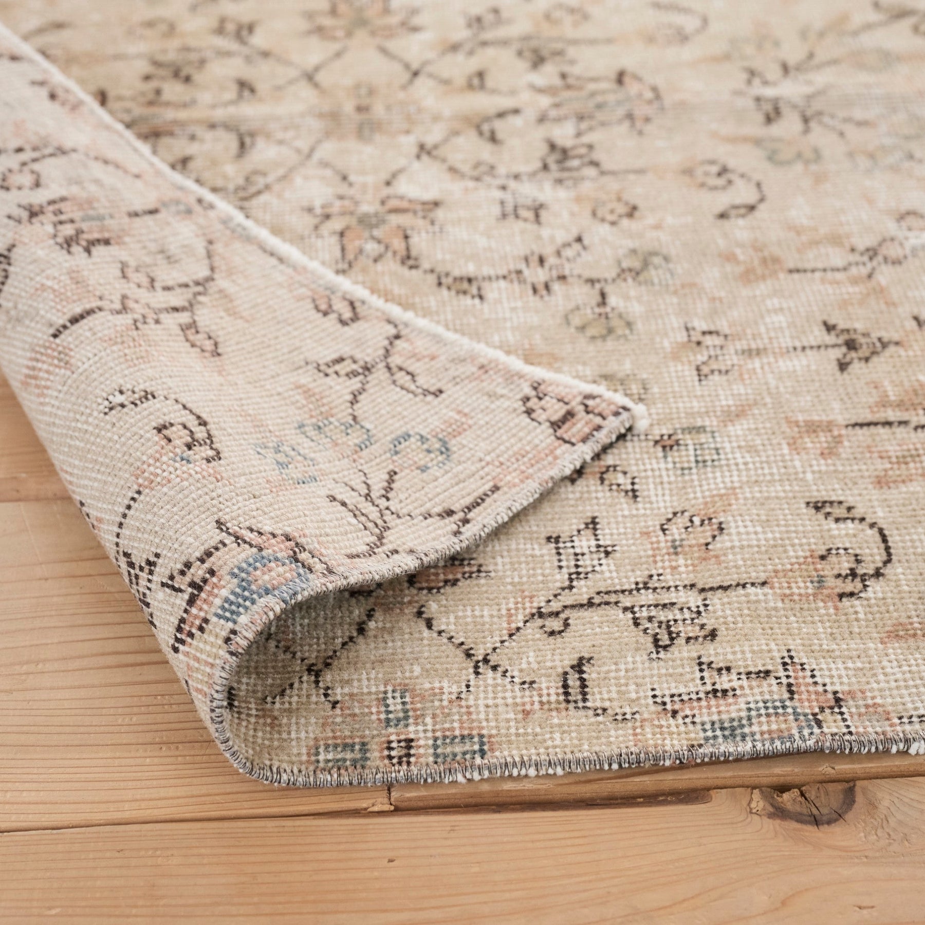 繊細な唐草模様と花柄が霞むように広がり、部分的に生まれた色の濃淡が、このラグだけの表情を描いています。